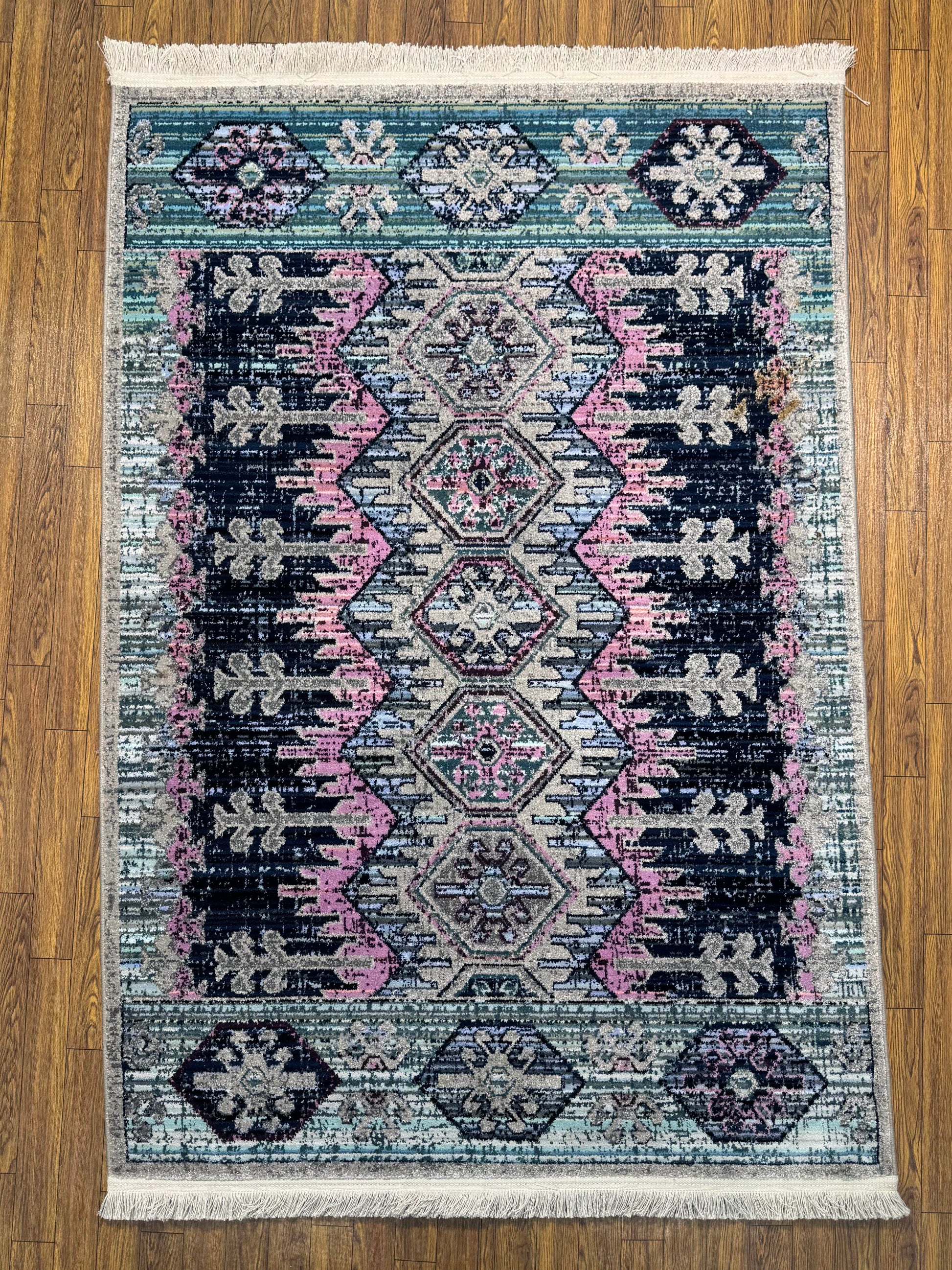 An eclectic bohemian rug featuring bold tribal chevrons and diamond patterns in a vibrant mix of navy blue, hot pink, and mint green.