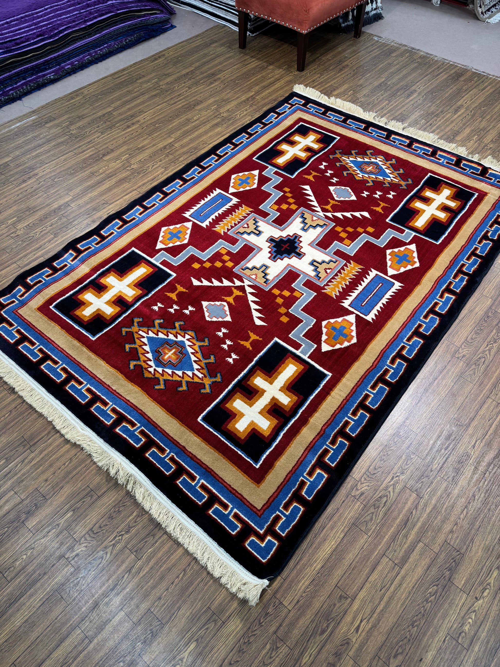 This rug draws inspiration from tribal and Kilim designs, offering a dynamic departure from classic floral patterns. The deep red field is energized by bold geometric motifs, including large cruciform and diamond shapes in saturated black, navy, and white. This creates a powerful, graphic statement that is both modern and rooted in heritage. The 5x8 ft size makes it a vibrant centrepiece for an eclectic living room, study, or entryway.