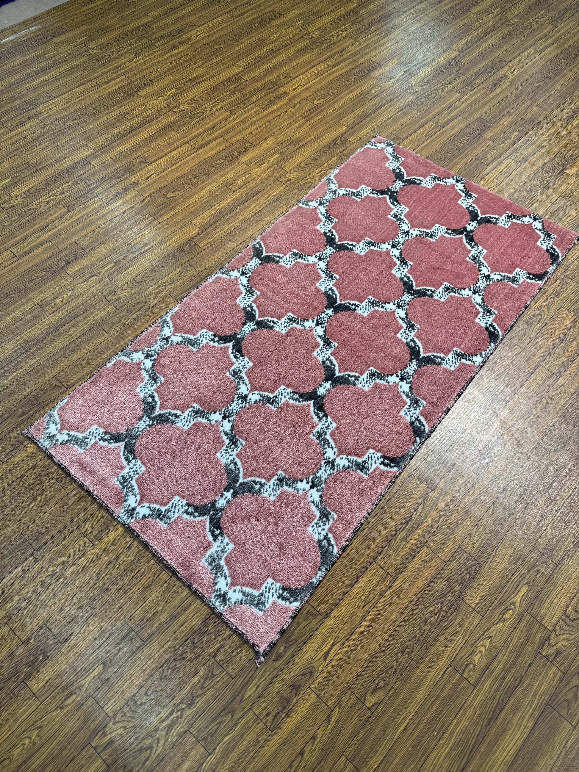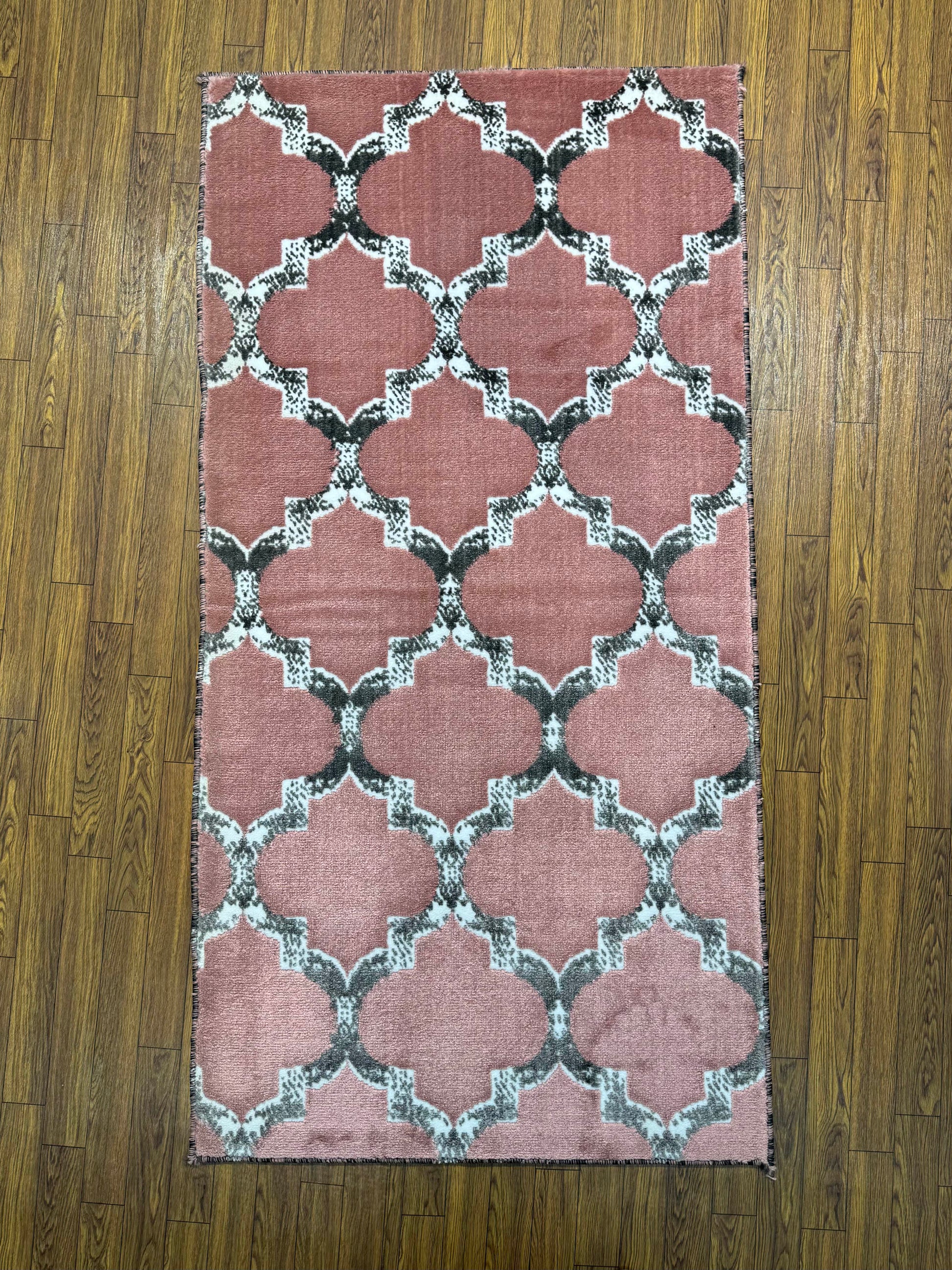 This rug brings a soft, contemporary feel to the classic Moroccan trellis (quatrefoil) pattern. The interlocking geometric design is rendered in a chic, muted color palette of dusty pink and charcoal gray, with a subtly distressed texture on the lines. The overall effect is serene, modern, and elegantly bohemian. This 3x5 ft runner is perfect for a bedroom, dressing area, or lounge seeking a touch of soft geometric sophistication.