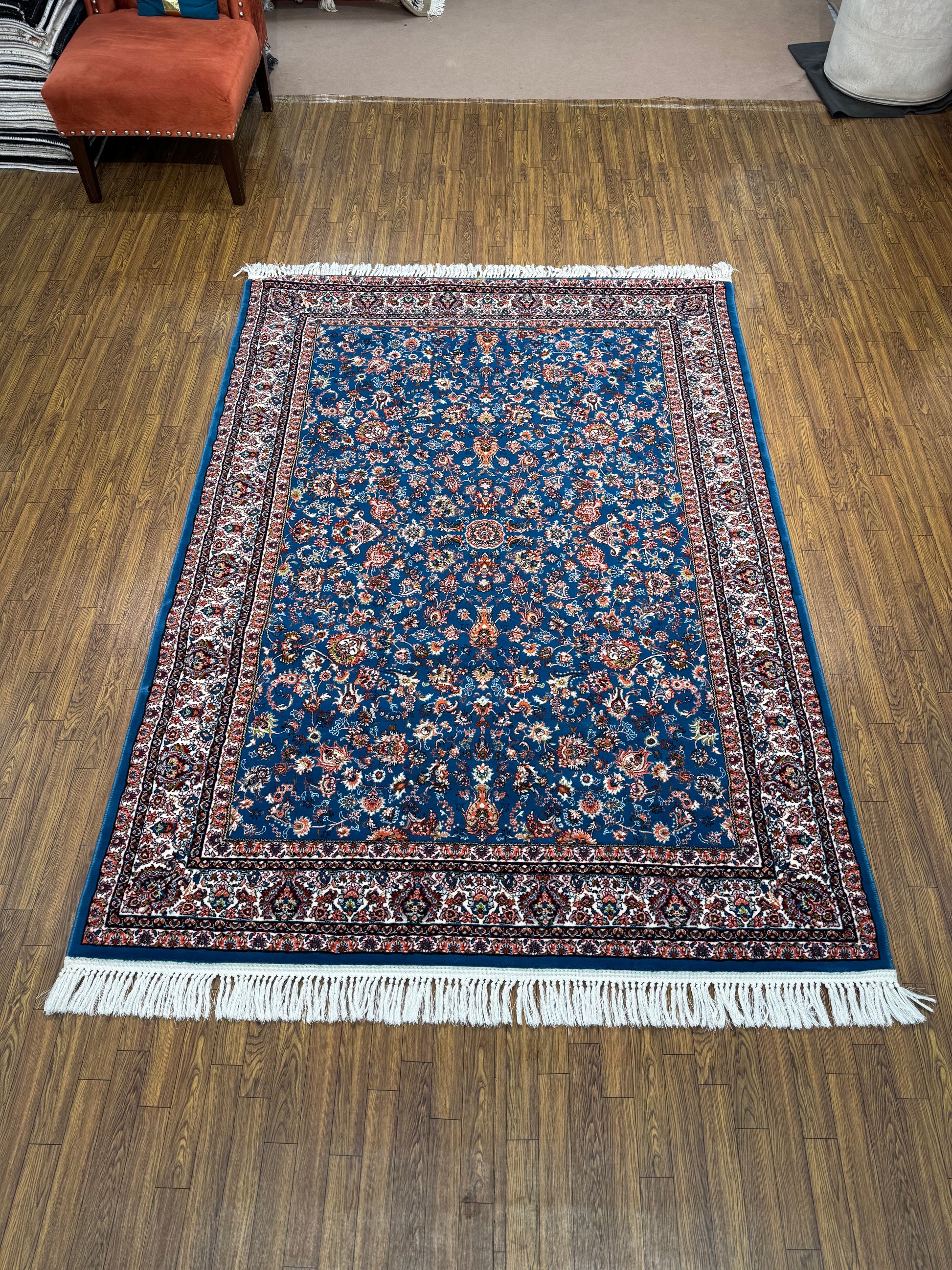This rug is a masterpiece of traditional Persian weaving, showcasing a meticulously detailed field filled with an endless array of florals and vines. The deep navy blue background allows the vibrant ruby red, gold, and cream motifs to stand out in beautiful contrast, creating a sense of luxurious depth. Enclosed by a complex, ornate border, this piece brings timeless elegance and a rich color story to any space. The 5x8 ft size is ideal for anchoring a living room or dining area.